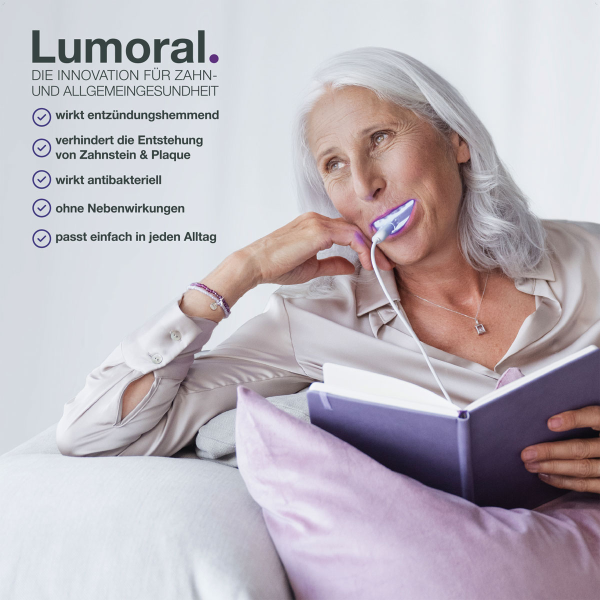 Perfekt saubere Zähne, gesundes Zahnfleisch und frischer Atem.Das Clinic Kit ist Ideal für die Erste & die Instruktions Behandlung. Das Gerät ist bei maximal 94C thermodesinfizierbar. Paketinhalt: 1 x Mundstück 1 x Box für Mundstück, 1 x Powerbank 1 x 10 LumorinseLumoral ist die perfekte Ergänzung für Ihre Zahn- und Mundpflege. Lumoral ist eine wissenschaftlich entwickelte medikamentenfreie Methode für die Behandlung und Prävention von Zahn- und Zahnfleischerkrankungen.Die Behandlung mit Lumoral zielt mit Ihrer antibakteriellen Wirkung nur auf den Zahnbelag ab, wobei die normale gesunde Mundflora in ihrem Gleichgewicht erhalten bleibt. Die nach Minze schmeckende Vegane Lumorinse-Mundspülung haftet an der Oberfläche der Plaque. Das Lumoral Licht aktiviert die antimikrobielle Wirkung, die sich gezielt auf den Zahnbelag richtet. Es werden so die schädlichen Bakterien abgetötet und der Zahnbelag kann leicht und vollständig mit einer Zahnbürste entfernt werden. Lumoral ist eine sichere und wirksame Methode zur Vorbeugung von Karies und zur Reduzierung einer Gingivitis. Endlich wirklich saubere Zähne und ein gesundes Zahnfleisch!